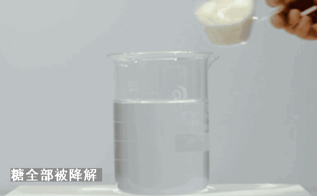 不到10秒钟,杯底砂糖全部被降解,“抗糖”效果肉眼可见。