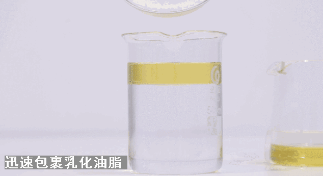 将吸油片磨粉加入到含油脂的水杯中,可以看到油脂马上被吸油片包裹下沉,杯子里的水质也瞬间变得干净澄亮。