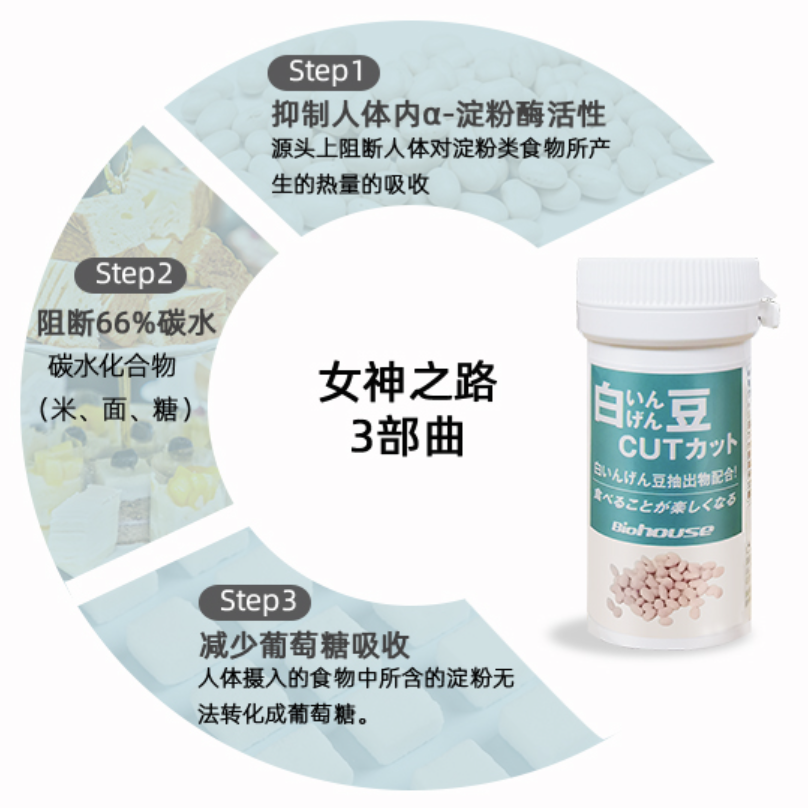 它能抑制人体过量分泌淀粉酶(即用于吸收淀粉热量的消化酶),剪断淀粉→单糖→脂肪转化链。