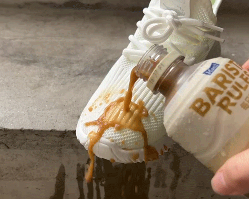 一整杯咖啡倒上去,全部被“弹开”,鞋面上干干爽爽,还不留一点污渍。