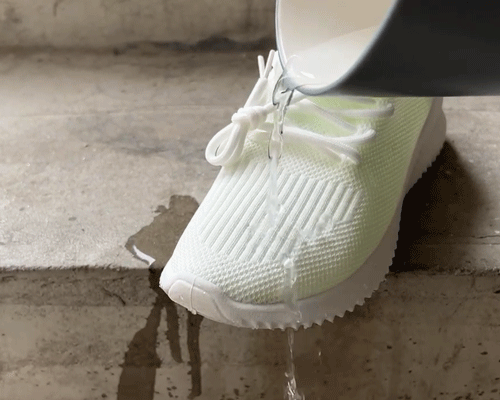 往鞋面上淋水,没想到鞋子里一点也没有湿,连表面的水珠都快速地滑走了。