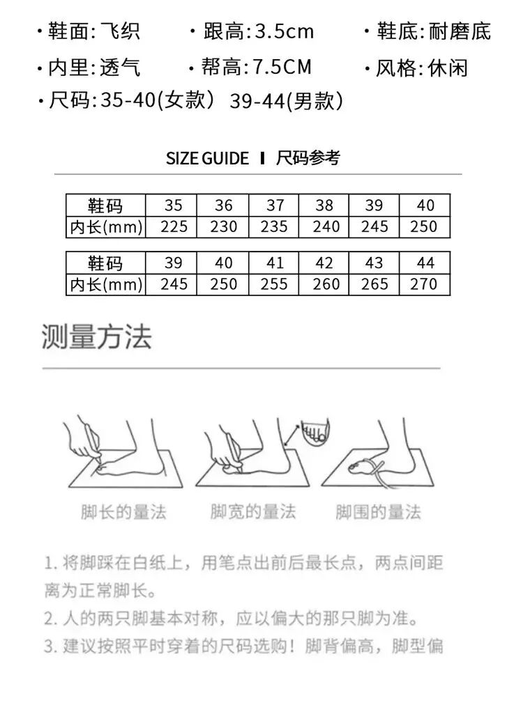 为了适应不同人群的穿着需求,鞋子码数齐全,从35~44都有涵盖,根据自己平时穿的码数买即可。