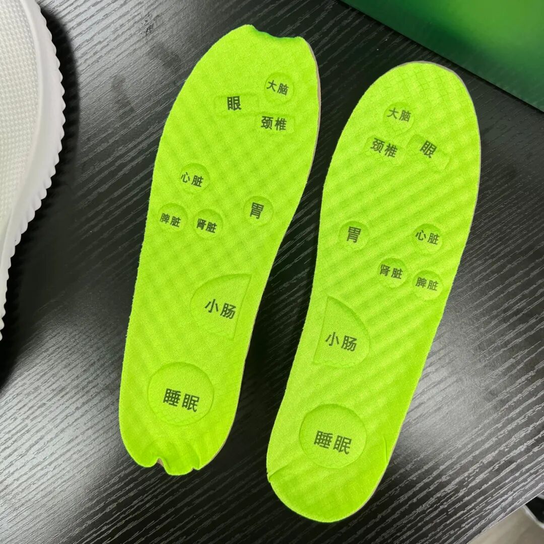 我很喜欢它的按摩鞋垫设计,鞋垫根据全身穴 位设置了凸起按摩点,包括大脑、颈椎、心脏、胃等。