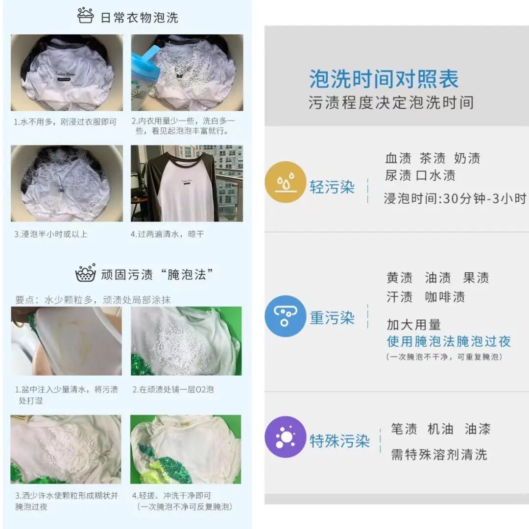 用O2泡洗白衣服,刚染上的污渍,只要一泡就干净,对于顽固的黄渍部位,持续使用会越泡越白,而且还不返黄!