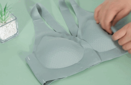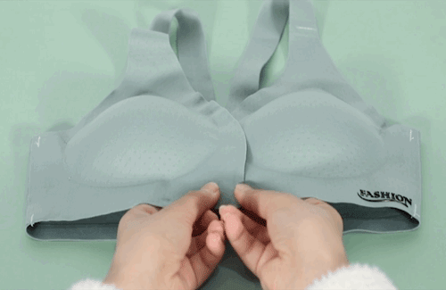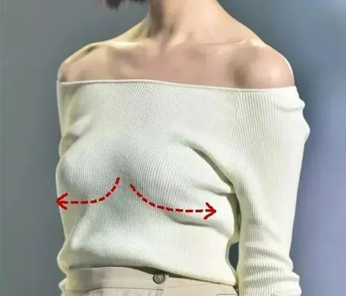 在内衣下围植入一圈点胶条,侧比、底围、肩带三处加宽,利用自身弹力牵引起乳房,将胸部向上、向中间科学提升,胸部自然而然的聚拢。