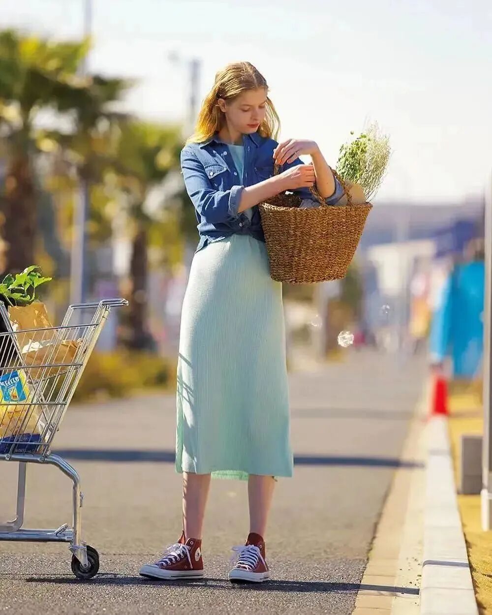 牛仔衬衫+长裙