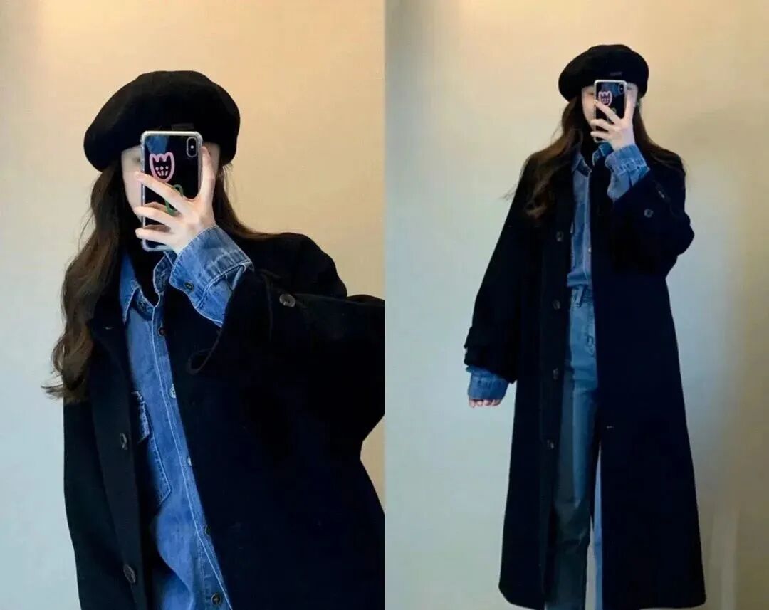 牛仔衬衫+呢子大衣