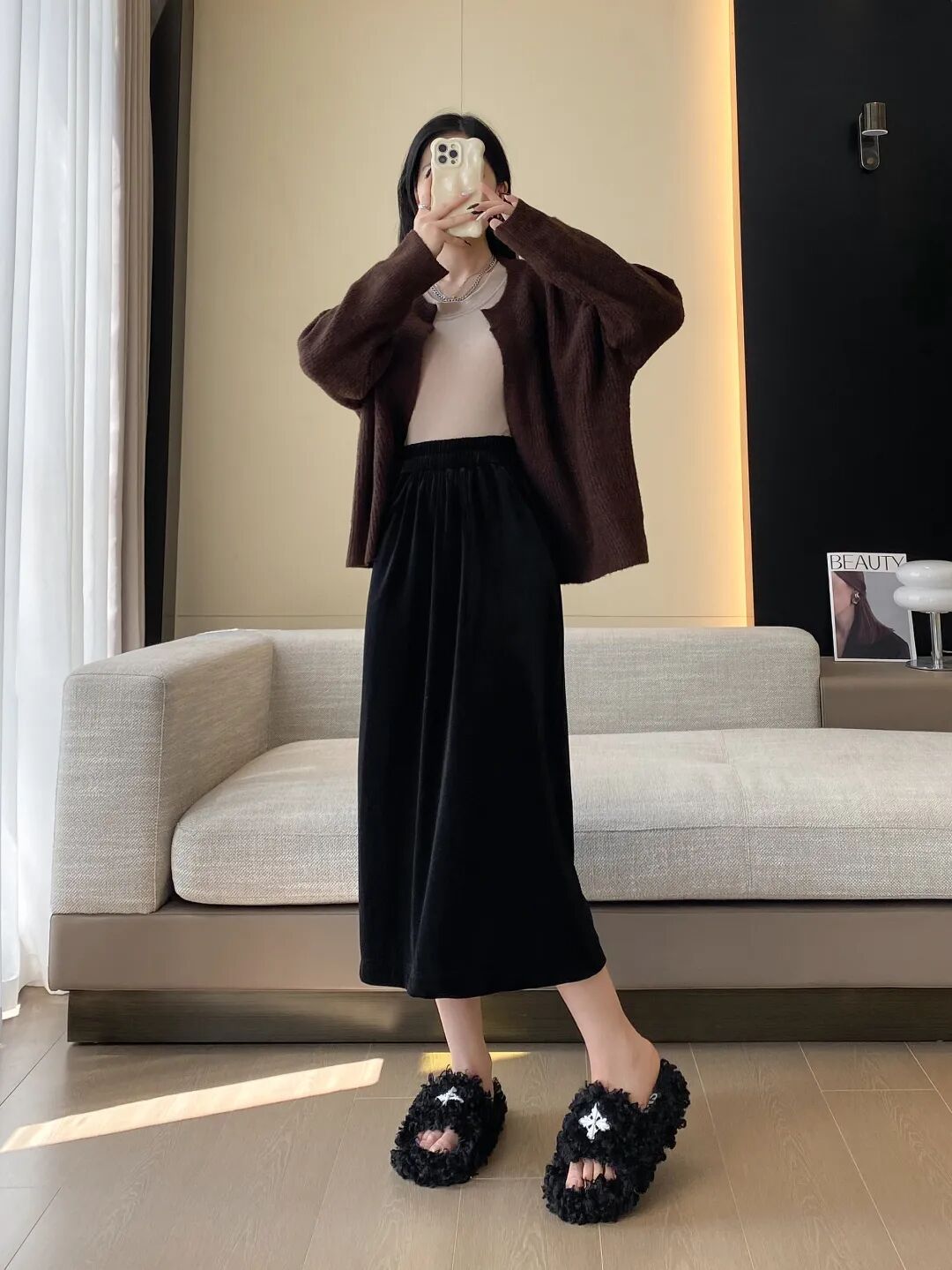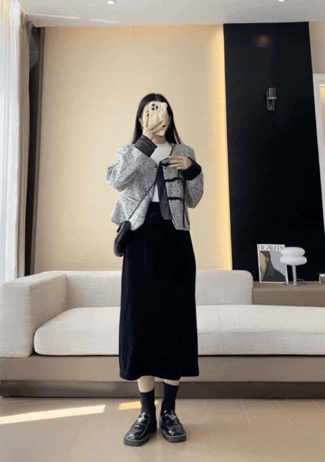 丝绒半裙搭配针织小开衫或毛衣,氛围感立马给到,更加平易近人,低调又不失气质,是特别名媛风的搭配。
