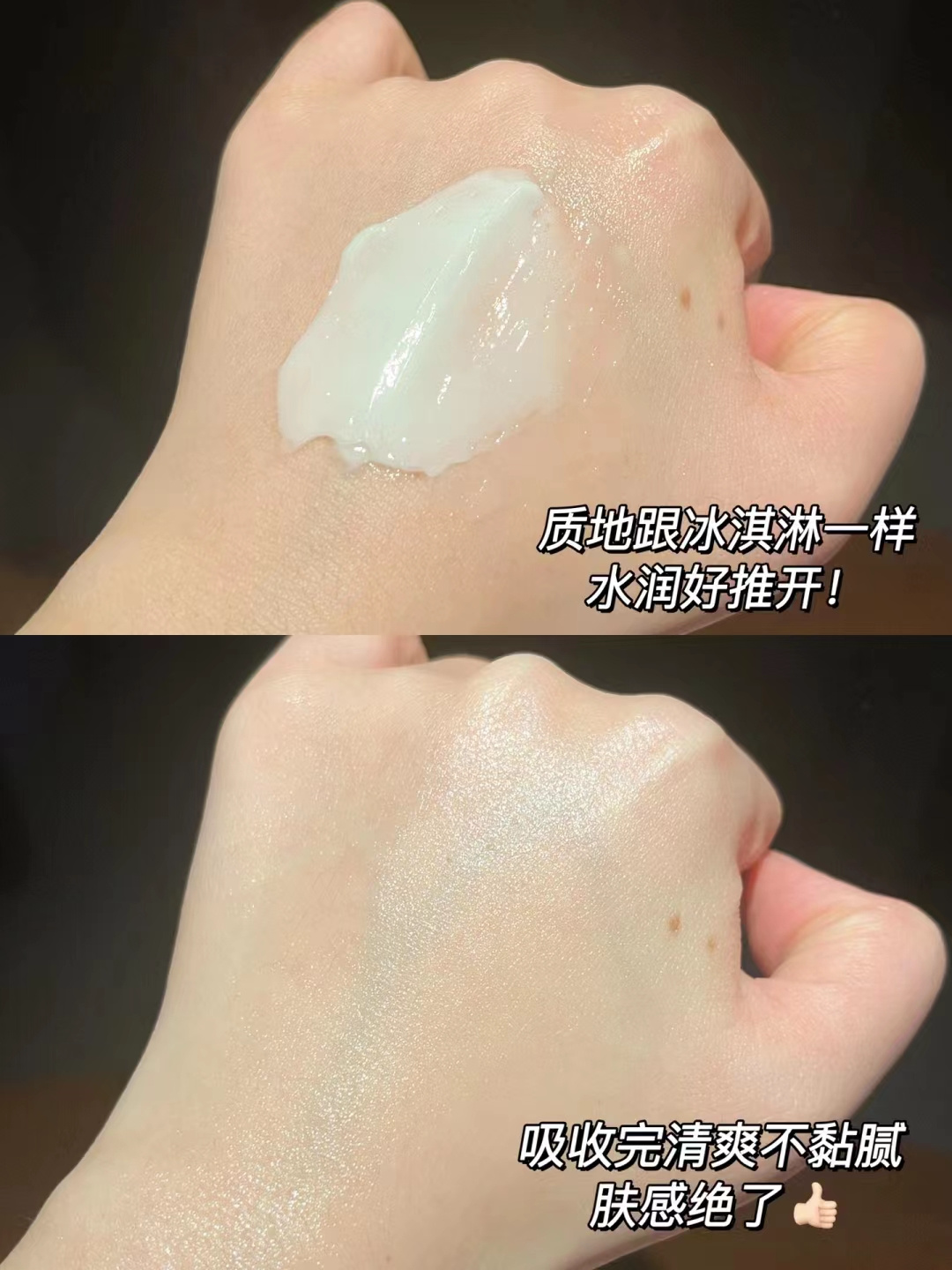 它的肤感是Q弹软滑的,上皮肤后还来不及反应,抹一抹就被皮肤呲溜溜地吸收了,不油腻也不闷皮肤。