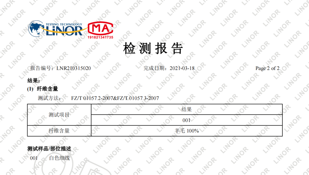 这可不是嘴皮子随便说说而已,这款羊毛衫可是有着相关的证明报告:报告显示这款羊毛的纤维含量是100。