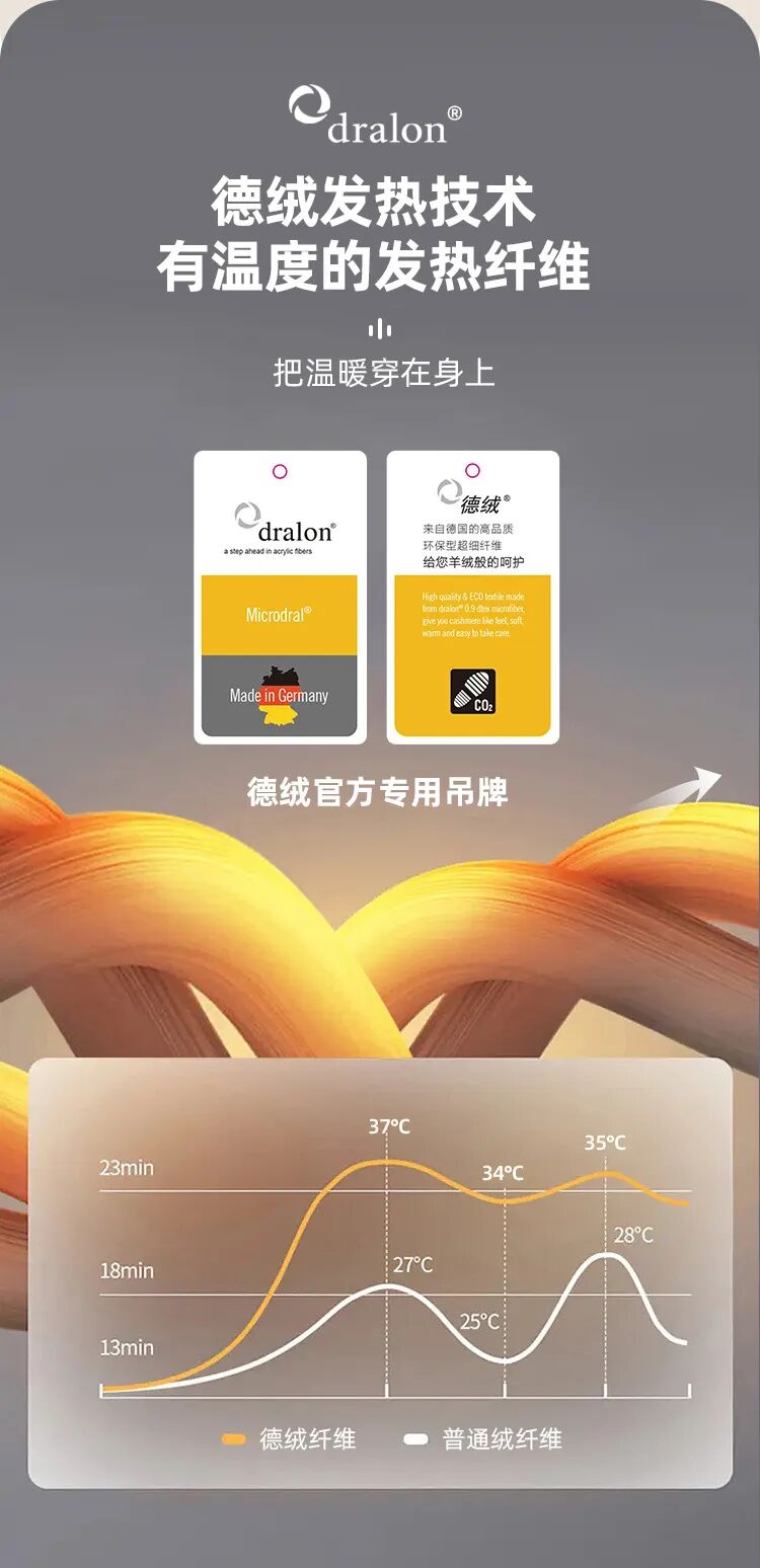 上身自带发热感,保暖效果比普通绒纤维更好。得到拜耳公司授权,是真正的「德绒」!