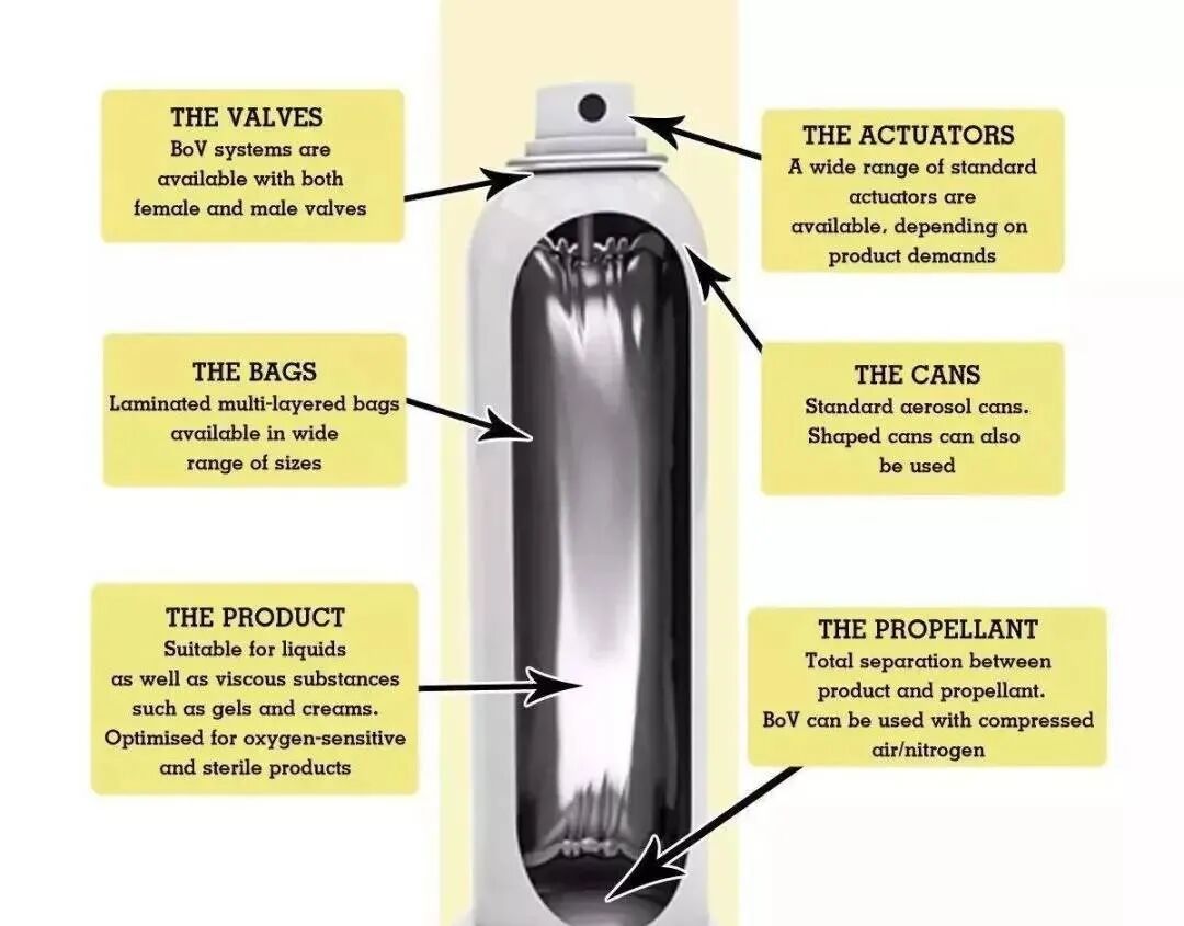 BOV技术(Bag on Valve):指使用专用的罐装设备将液体压缩到瓶中阀袋,用来压缩的气体推进剂则封装在瓶身与阀袋的隔室中,从而使压缩气体与液体完全隔离的压缩技术。