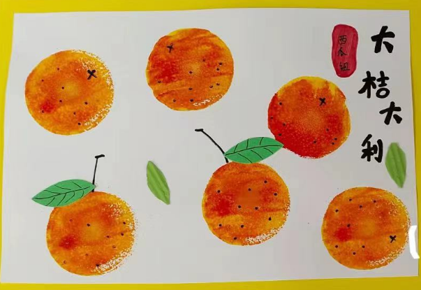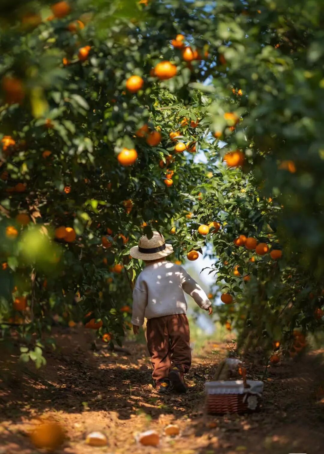小朋友们提上小篮子,走进雾柑林里,挑选成熟的雾柑放进篮子里。