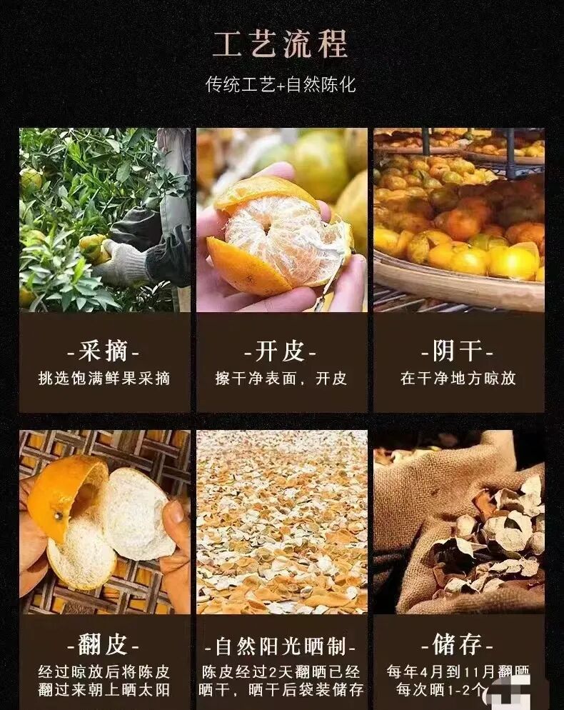 采摘-开皮-阴干-翻皮-自然阳光晒制,然后还要经过几年的时间反复晒制,才能得到最后越陈越香又功效十足的陈皮。