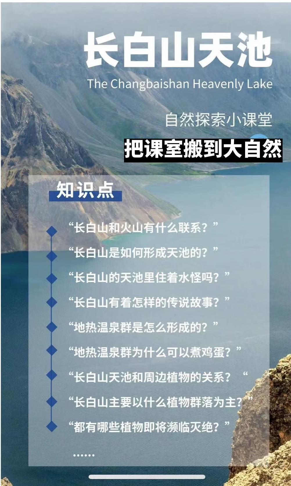 ● 到达书本里的天池,探寻天池作为火山口湖的地质地貌?作为中朝界湖的历史和意义?有关于天池水怪的传说和秘密……