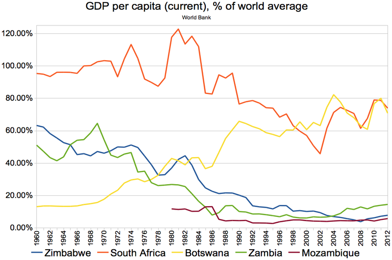 ▲ 津巴布韦的人均GDP在1960年曾达到世界水平的60%多(蓝色),但随后一直下降,甚至一度少于10%