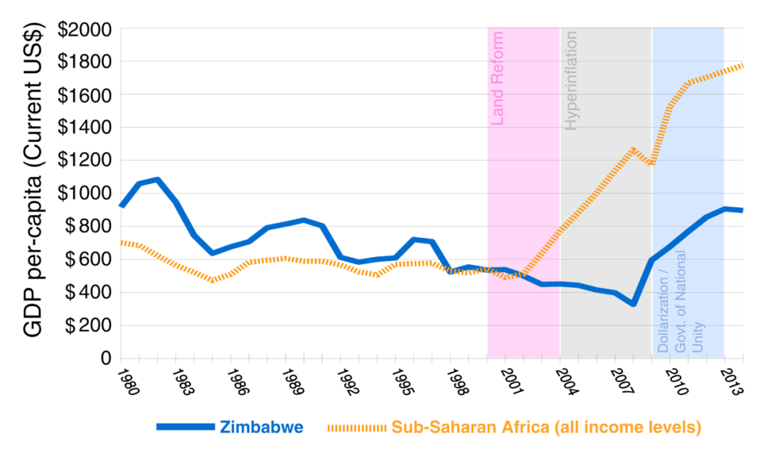▲1980年来津巴布韦(蓝)和撒哈拉以南非洲国家(橙)的人均GDP变化,津巴布韦一直呈现下降趋势