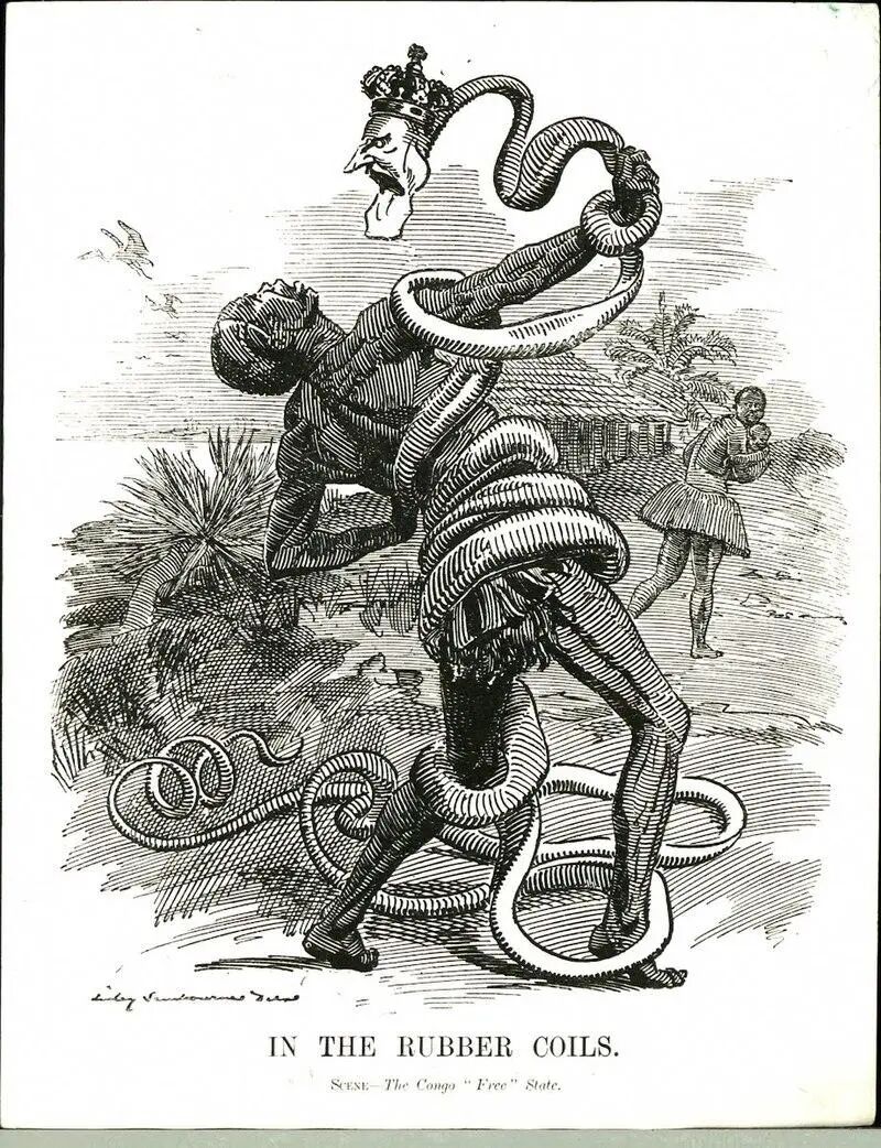 ▲1906年把利奥波德二世比喻成缠绕着黑人的橡胶藤的讽刺画