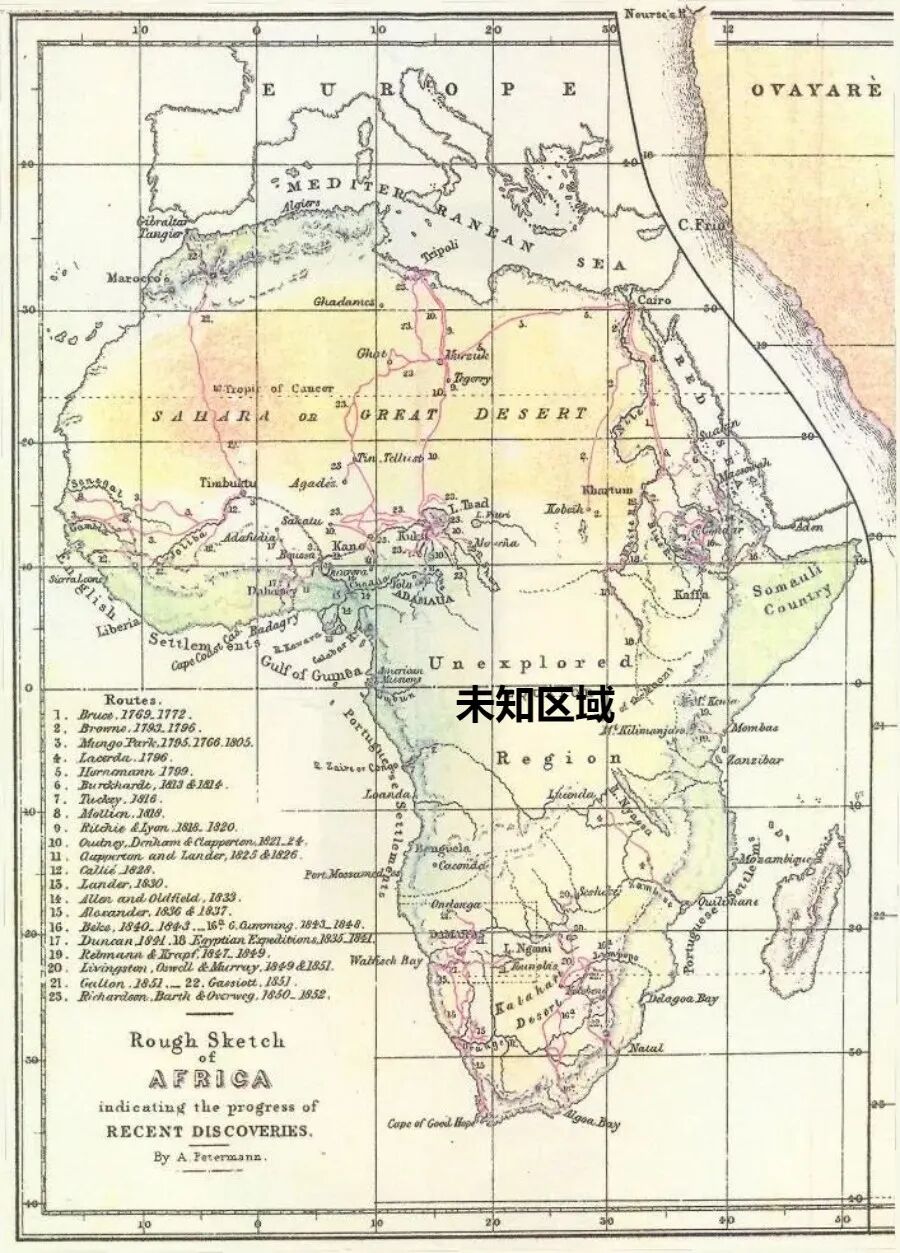 ▲1853年地图上的非洲大陆中央还显示为未探索区域