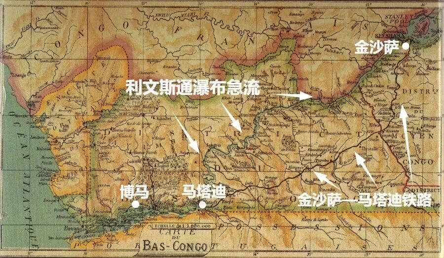 ▲1898年金沙萨(利奥波德城)—马塔迪铁路建成,刚果河上游货物可以通过铁路运输到马塔迪后通过河运出海