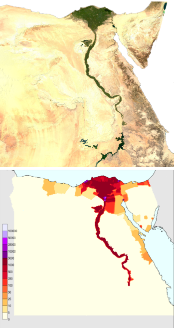 ▲埃及地貌和人口密度,尼罗河两岸居住了上亿埃及人口