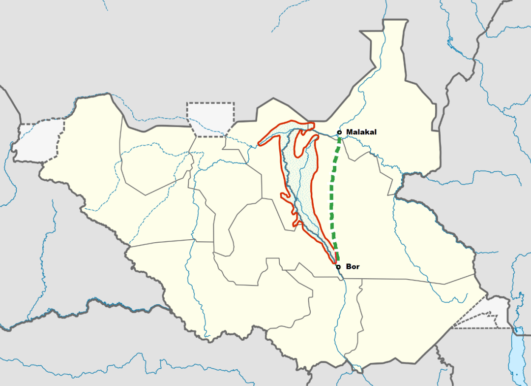 ▲现在位于南苏丹境内的沼泽湿地(红色)和已终止的琼莱运河项目(绿色)