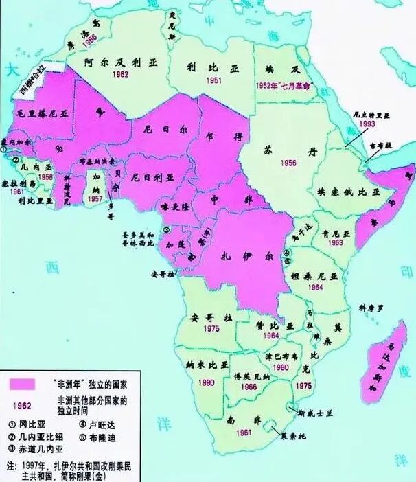 ▲非洲各国的独立时间(粉紫色为1960年独立的国家,扎伊尔为现今刚果民主共和国)