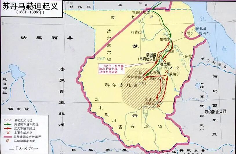 ▲马赫迪起义军的控制范围,英国势力仅龟缩于沿海据点