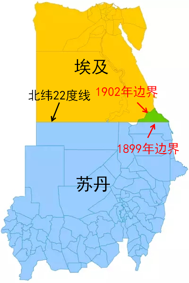 ▲1899年和1902年,英国殖民当局两次划分埃及和苏丹边界,绿色代表哈拉伊卜三角区