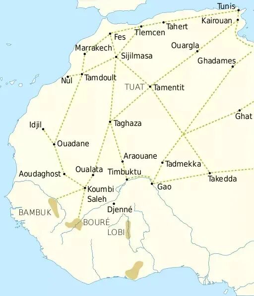 ▲公元十一世纪-十六世纪的跨撒哈拉贸易路线