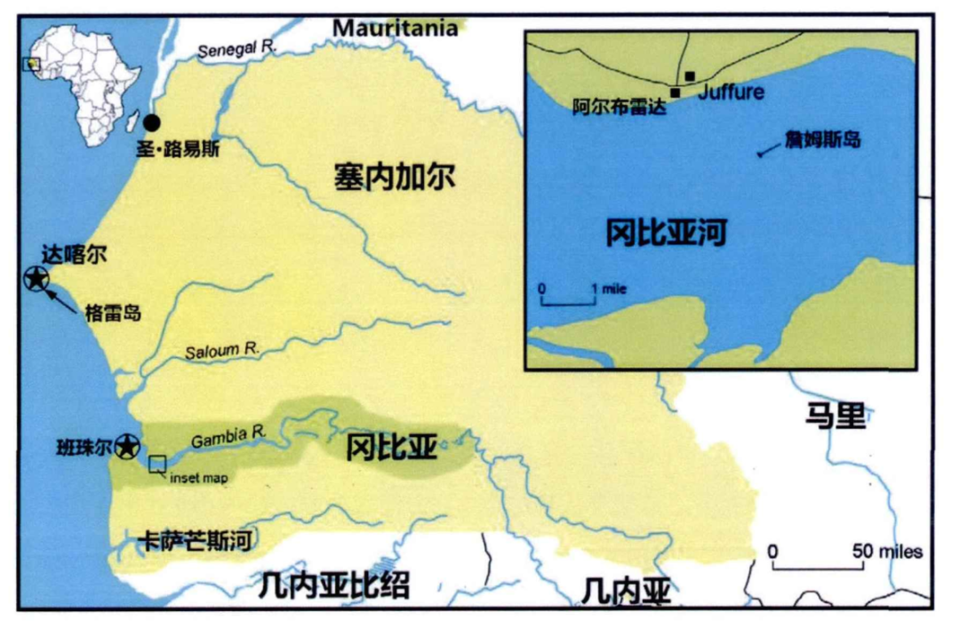 撒哈拉沙漠以南的非洲大陆北部,覆盖着广阔的热带草原,历史上,这里是黑人的故乡。两条大河-北边的塞内加尔河和南边的冈比亚河在草原西部流淌,蜿蜒向西注入大西洋。河流滋养了肥沃的冲积平原,流域内也因此分别得名塞内加尔和冈比亚。起源于内陆的黑人在迁徙过程中,一部分定居到这里,成为这片沃土上的主人。
