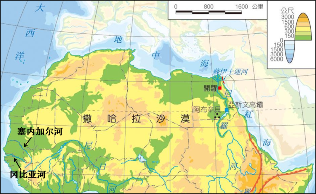 ▲非洲地形图(局部),塞内加尔河和冈比亚河位于西非,并注入大西洋