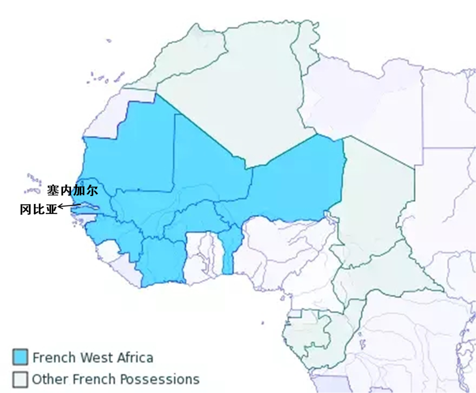 ▲英国殖民地冈比亚被嵌在包括塞内加尔在内的法属西非(蓝色)之中