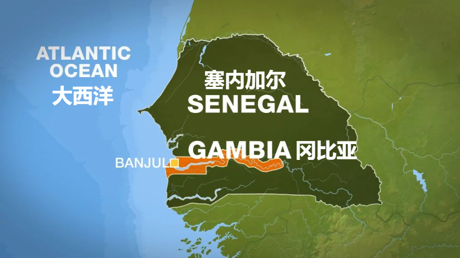从地图上看,冈比亚被塞内加尔三面包围,两个国家酷似一个夹心蛋糕。作为一个面积仅约1万平方公里的非洲大陆最小国家,冈比亚却拥有非洲最佳水道之一-冈比亚河的主体部分,其领土完全沿河分布:最宽处不超过48公里,而长度却沿冈比亚河两岸深入内陆300多公里,国土形状犹如蚯蚓一般,几乎将塞内加尔拦腰截断。