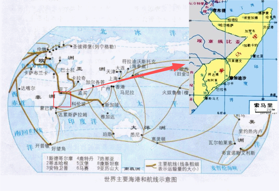 ▲非洲之角(红框处)附近海域是世界重要的贸易航线