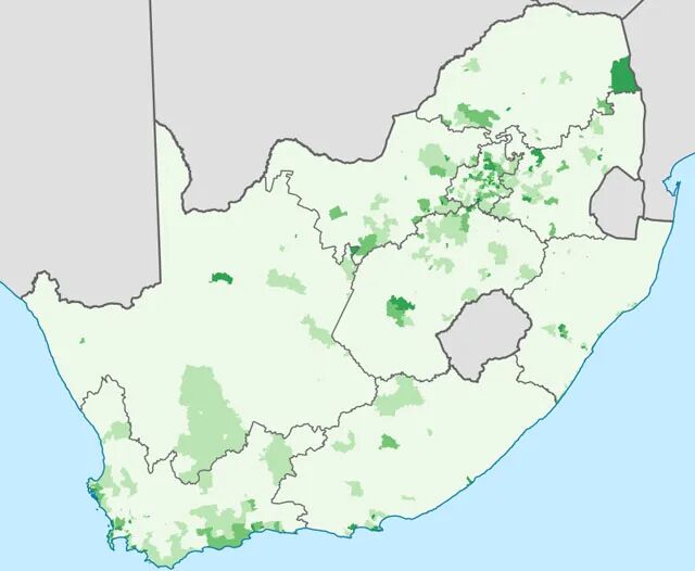 ▲南非白人在各地区的人口比例,绿色越深,比例越高