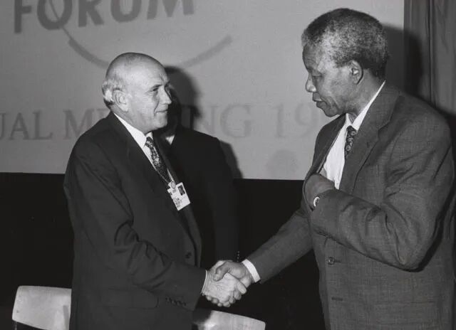 ▲1992年曼德拉与南非总统德克勒克在达沃斯握手,标志着种族隔离制度已走到尽头
