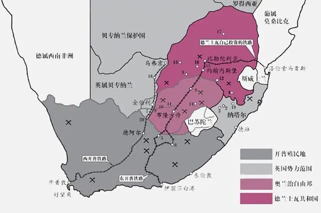 英国人本来满足于沿海的殖民地,但是随着布尔人国家境内发现特大金矿,英国人反悔了,在19世纪末发动两次布尔战争,再加上征服祖鲁王国,建立起一个庞大的南非殖民地,即现代南非共和国的前身。