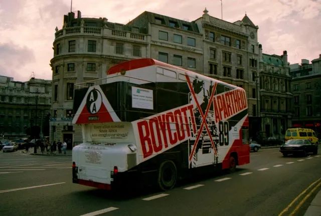 ▲虽然英国是南非的前宗主国,却带头反对种族隔离制度,图为伦敦公交车上的抗议广告