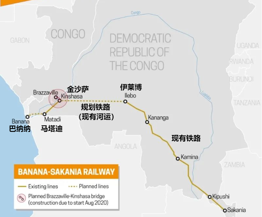 在东方,刚果东线铁路将矿产运输到与坦桑尼亚的边境,再通过公路、航空等方式运往坦桑尼亚的港口城市达累斯萨拉姆,整个运输过程大约需耗费三周时间。