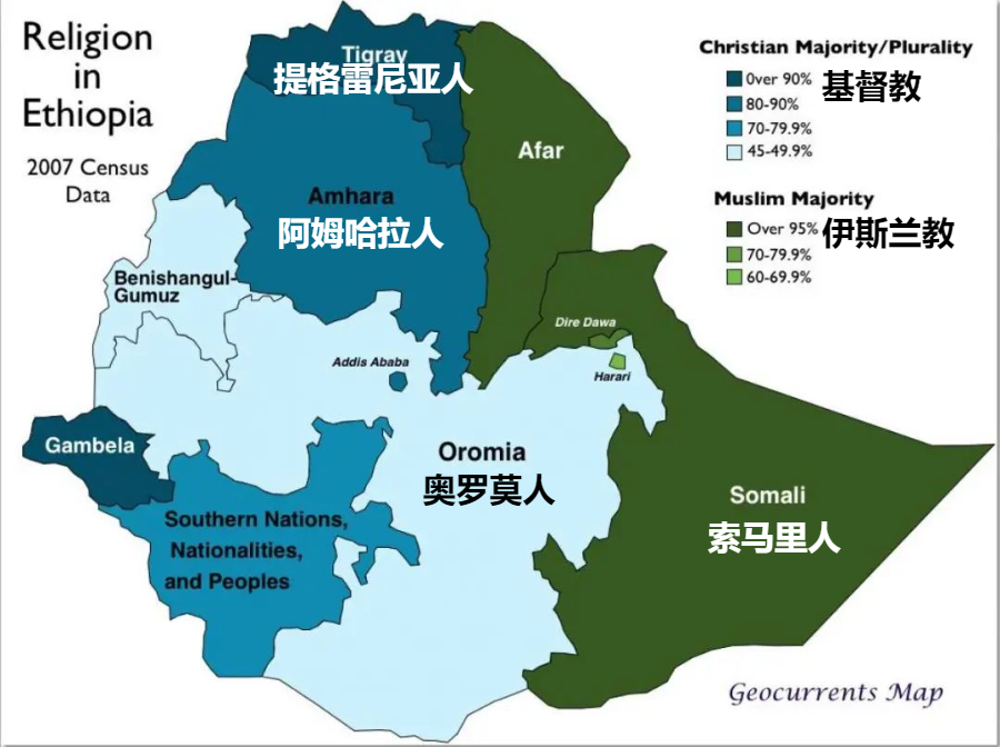 ▲埃塞俄比亚的四大民族和两大宗教分布