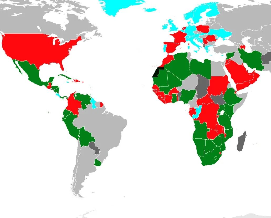 ▲支持摩洛哥的国家(红)和支持西撒人阵的国家(绿)