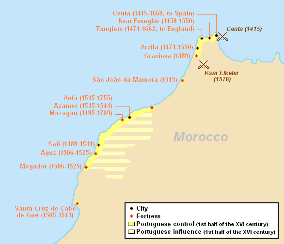 在收复失地运动接近尾声的15世纪,葡萄牙和西班牙开始越过直布罗陀海峡向南和西扩张,在摩洛哥的大西洋沿岸建立坚固的前哨作为贸易港口。