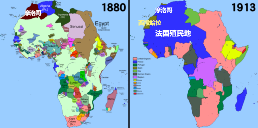 ▲1880年和1913年的非洲地图对比,西北角为摩洛哥