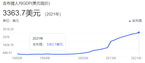 所以就经济来说,吉布提虽然目前仍面临自然资源贫乏,工农业基础薄弱等困难,但得益于自己的地理优势与周边环境,人均GDP已经从本世纪开始的700美元,在2021年达到了3300美元,放在非洲也算是不错了。