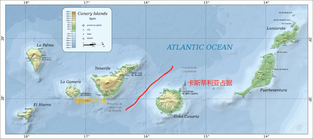 加那利群岛因而变成了被西班牙和葡萄牙瓜分。由于群岛内部个岛屿之间距离相对较近,西班牙极易通过加那利群岛进攻葡萄牙。