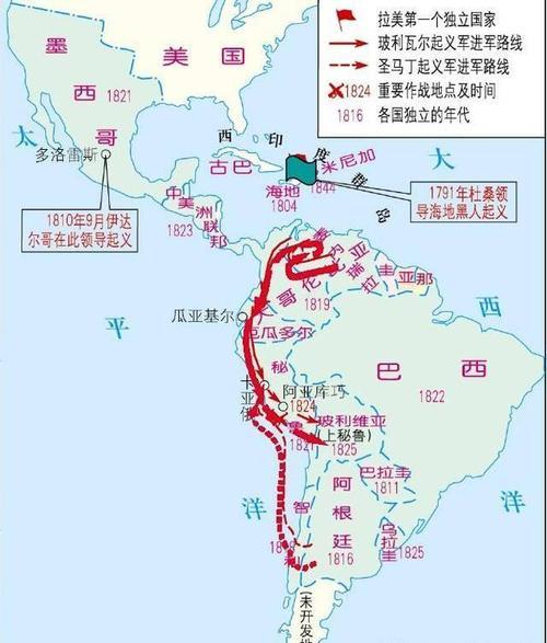 这一切在19世纪发生了改变。19世纪初,西班牙在美洲的殖民地爆发了独立运动。西班牙在美洲的殖民地除了古巴岛、波多黎各岛等加勒比海诸岛之外,其余殖民地全部独立成功。