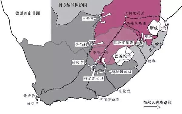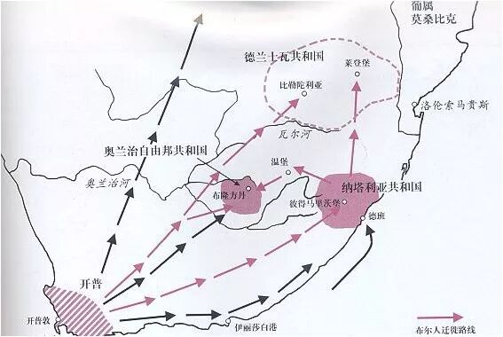 英国在占领好望角后,不仅对当地的土著,而且对布尔人征收重税进行严苛的统治,引起了布尔人的不满。布尔人一看也打不过英国只能离开好望角殖民地,开始集体向北迁移。1852年在非洲内陆建立了德兰士瓦共和国,首都为比勒陀利亚。