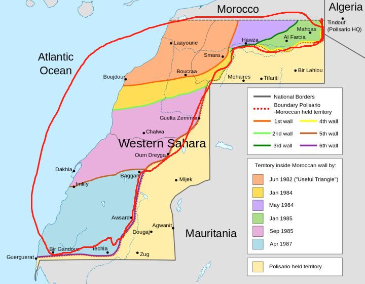 ▲摩洛哥和西撒人阵占领区示意图,红圈为摩洛哥占领区