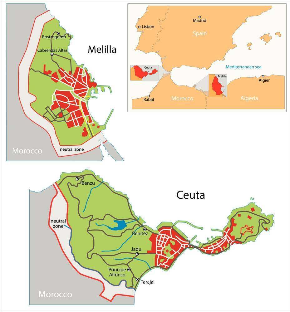 ▲西班牙从葡萄牙手里夺取的两大城市休达(下)和梅利利亚(上),这两座城市至今依然属于西班牙,为摩西关系紧张埋下隐患